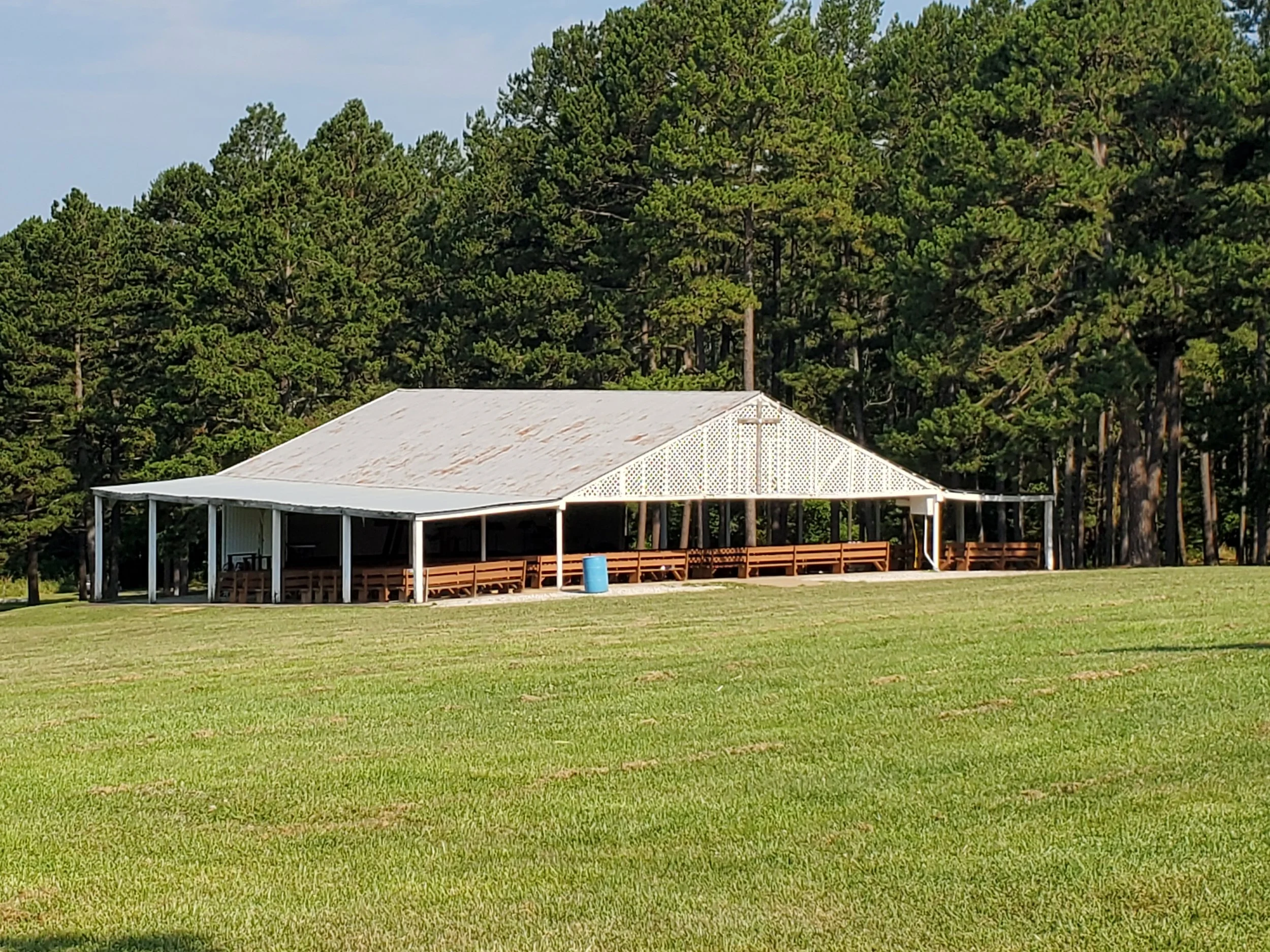 The camp has a swimming pool, basketball court, sand volleyball court, gaga ball pit, and a climbing wall. There is an open-air tabernacle for worship services. We have a cafeteria with a commercial kitchen, a pavilion with tables, a snack shack with sliding windows, a shower house, cabins, and camper sites.