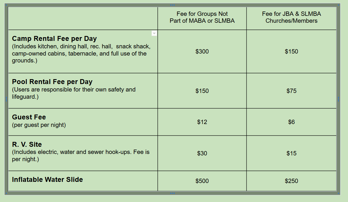 Fee Schedule for Day Use, Retreats and Non-Associational Camps